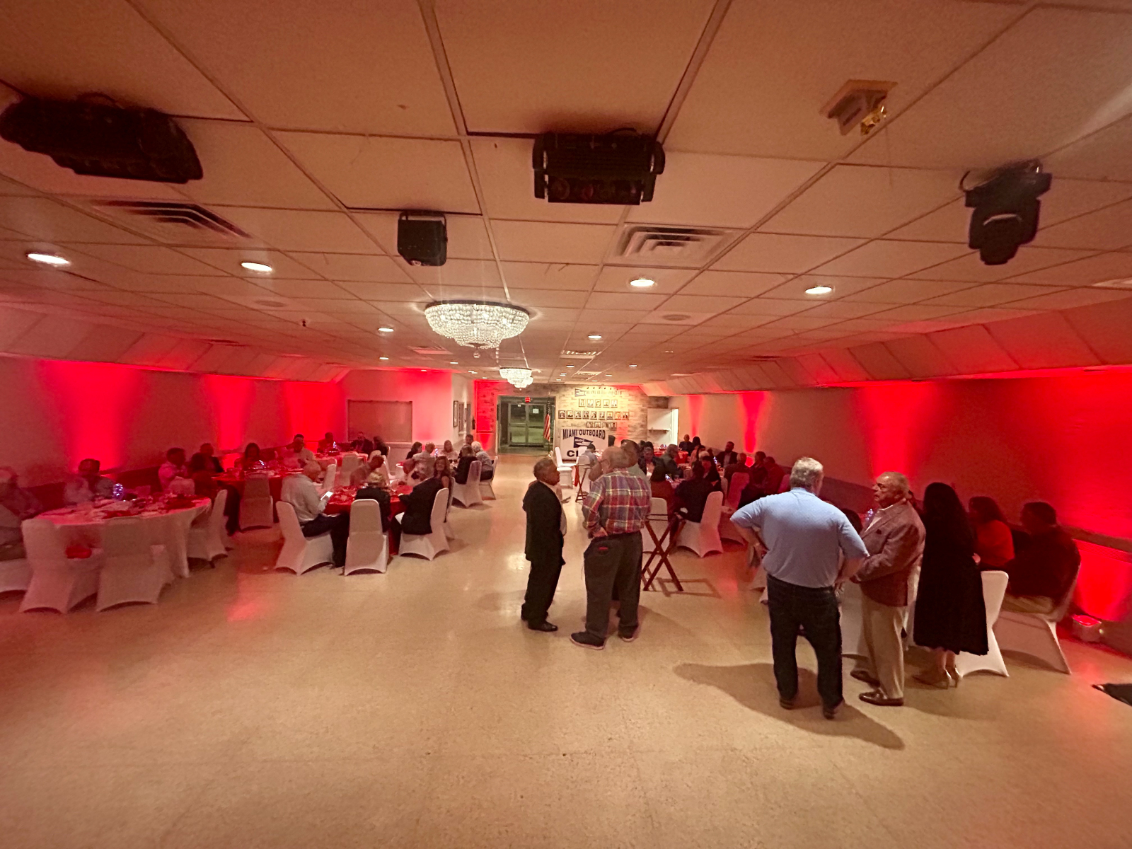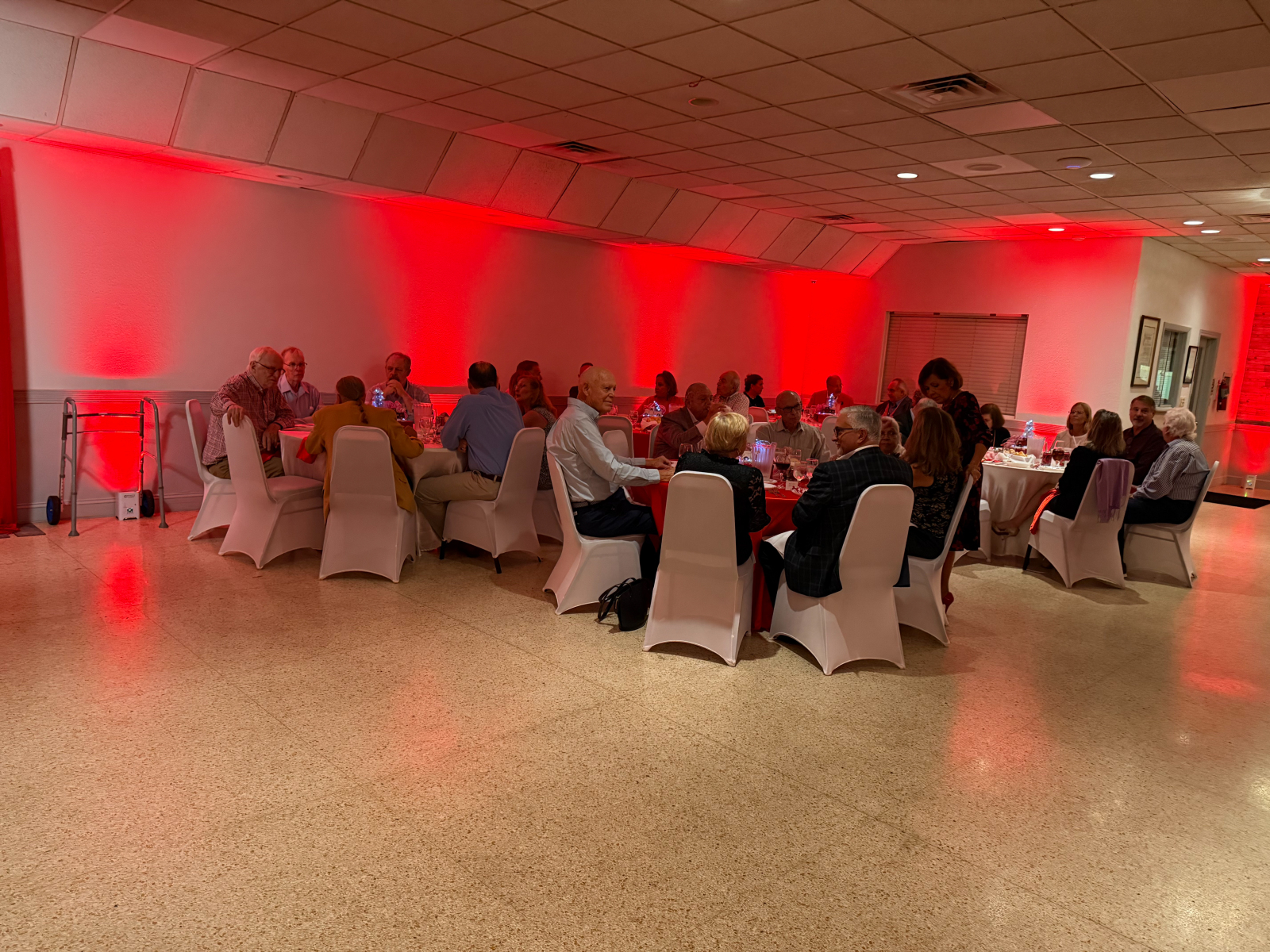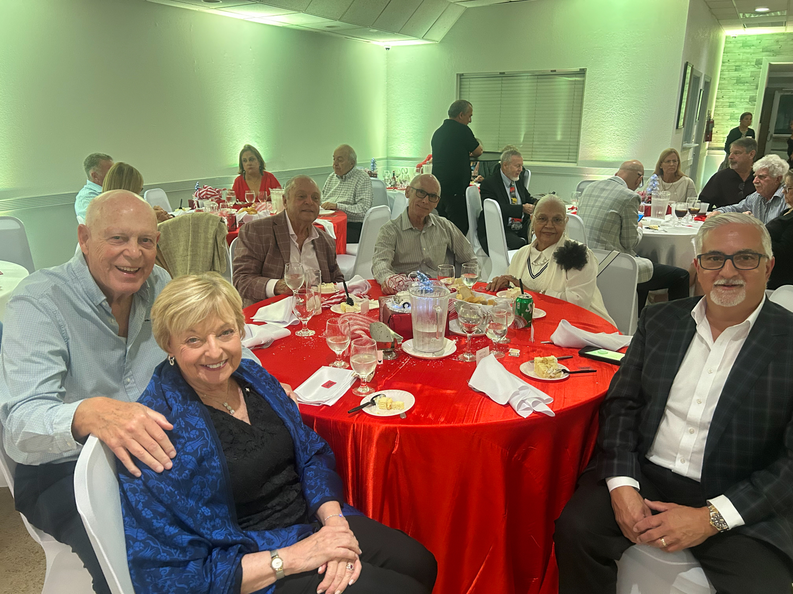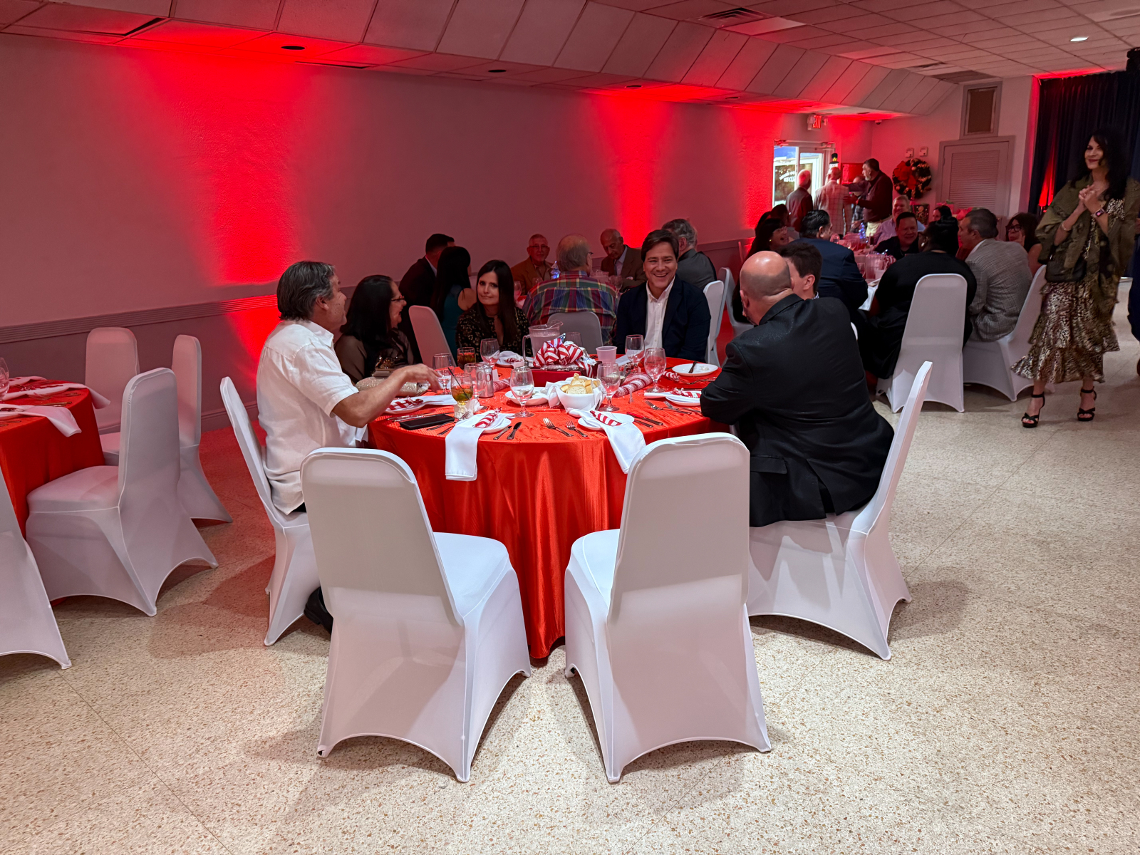 As the members arrived they were greeted by Jean and Ed and guided to the cocktail hour by the Tiki bar, appetizers and beverages were served as the club members mingled and awaited to enter into the main ballroom. At 7:15 the members were welcomed into the main dinning room as they collected their name cards on the way way inside. Once everyone was inside president Tomas Hernandez opened up with a welcoming to everyone, then Manny Garcia said a blessing over the whole evening. Then the DJ tony announced that each table would be called in order to take pictures at the step and repeat and Al Padilla would be acting photographer. During the picture time the staff started bringing out and serving bread and salads